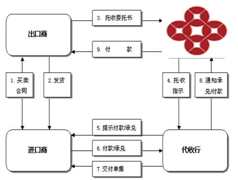 我行受出口商委托,憑其提交的出口商業(yè)單據(jù)和金融票據(jù)通過代收行向進(jìn)口商收取款項(xiàng)。