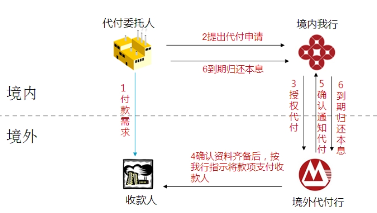進口海外代付業(yè)務是指進口商為履行貿(mào)易合同項下的付款責任向我行提出融資申請,在滿足我行要求的條件后,我行指示海外代理行代為對外付款,進口商在約定的融資到期日償還我行上述款項的短期資金融資業(yè)務。